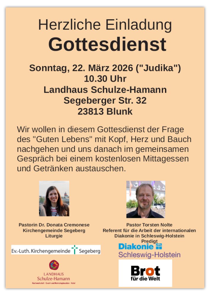 Wir wollen in diesem Gottesdienst der Frage des „Guten Lebens“ mit Kopf, Herz und Bauch nachgehen und uns danach im gemeinsamen Gespräch bei einem kostenlosen Mittagessen und Getränken austauschen.
